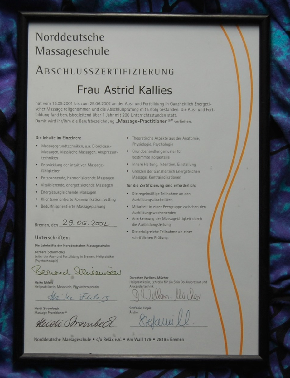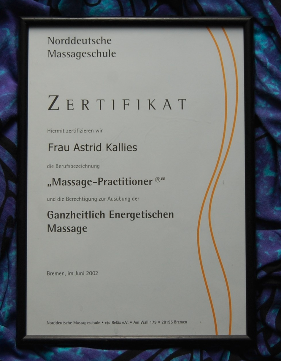- Um Ihnen die Massage zu ermöglichende Sie für Ihr Wohlbefinden benötigen, habe ich mich in diversen unterschiedlichen Massage-Techniken schulen lassen.